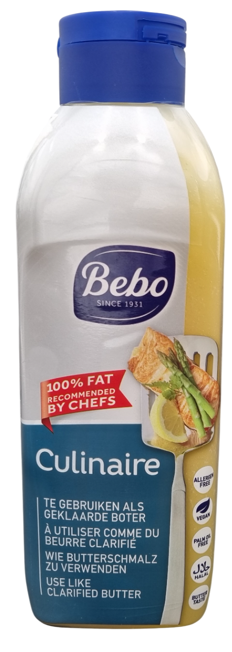 Bebo Culinaire 750 ml este o grăsime culinară premium, creată special pentru bucătăria profesională. Concepută pentru a înlocui untul clarifiat, acest produs oferă 100% grăsime, rezistență excelentă la temperaturi ridicate și un gust neutru, ideal pentru preparate proaspete, uniforme și perfect rumenite.